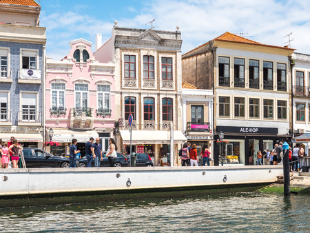 Aveiro, Portugal - July 9, 2017: View of the tourists enjoying the typical architecture in the main channel of Aveiro