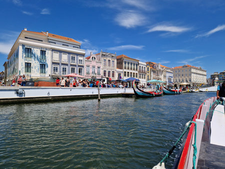 Aveiro, Portugal - 19 August 2019: Main canal through the center of Aveiro with tile decorated houses and offfices