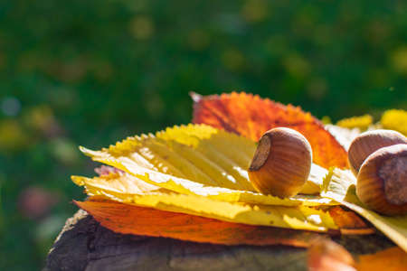 Hazelnuts Among Fall Colored Leaves In The Forest Enlightened by Sunset