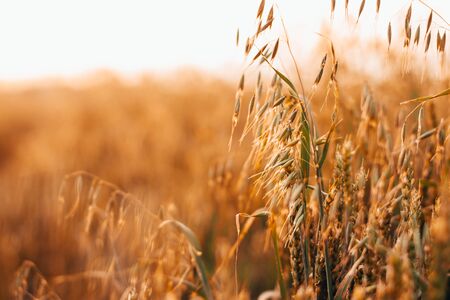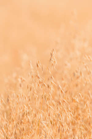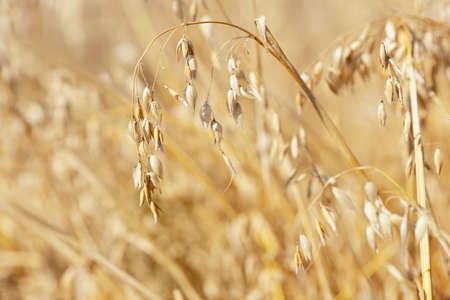 organic golden ripe ears of oats in field, soft focus, closeup, agriculture background