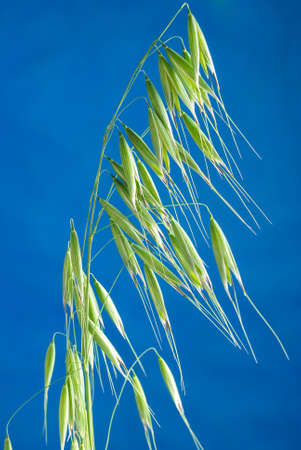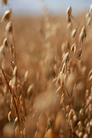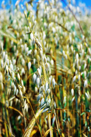 Oat florets on sunlit field with bright blue sky. Summer or autumn grain crop season. Gluten