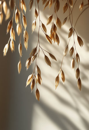 Golden branches hang down gently, creating intricate shadows on a light wall, enhancing the tranquility of a cozy interior setting filled with natural light.