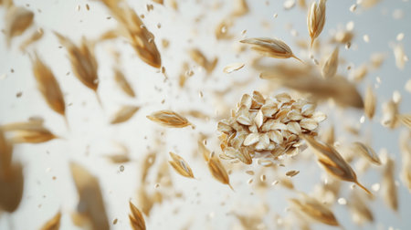 Close-up studio shot showcasing numerous oat grains and seeds suspended against a clean, white backdrop, emphasizing their natural texture and golden color. Perfect for nutrition concepts.