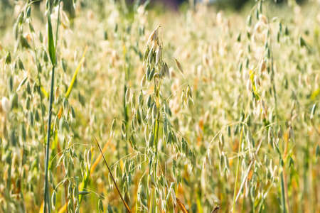 Green organic oat crop plantation field, selective focus