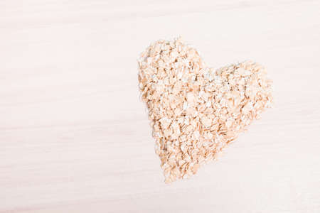 Oat flakes in a wooden bowl in the shape of a heart, top view