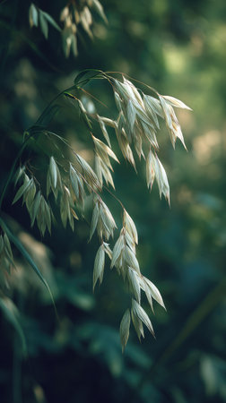 A detailed photograph of a single Oats, swaying gently in the wind, captured in natural daylight. Fresh and airy atmosphere, soft motion blur on leaves, crisp details on textures, background softly blurred into natural greenery, cinematic natural light, realistic photography.