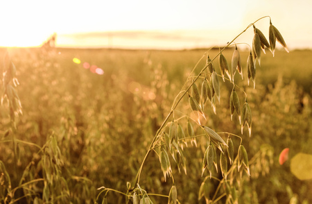 Field of oat during sunset.Oat stems on a background of setting sun and sunset colorful sky.Tranquil natural background.
