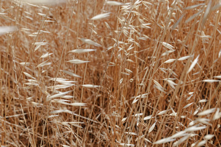 Ripe oat crops in field ready for harvest, swaying in wind, selective focus