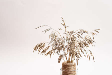 Dried flowers. Field dry spikelets and herbs in vases on a light pink background. Autumn concept