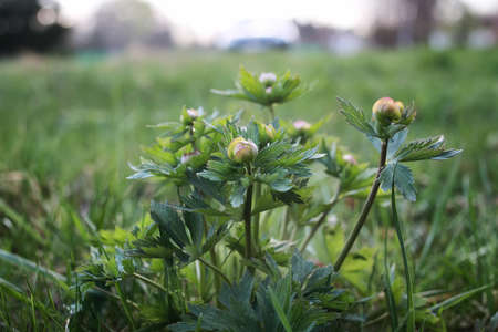 Globeflower (Trollius europaeus) on the green leaves background. Close-up. Selective focus.