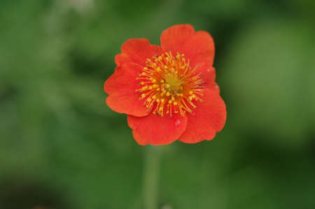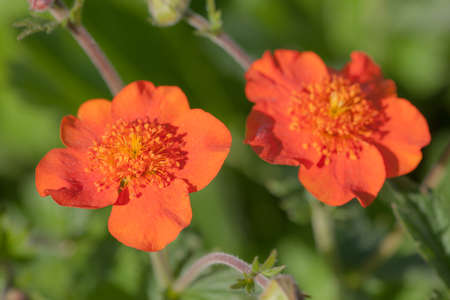 Geum coccineum in the spring garden. Red blooming flowers Geum aleppicum on a green background. Close up.