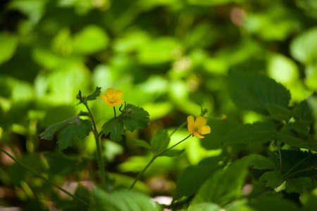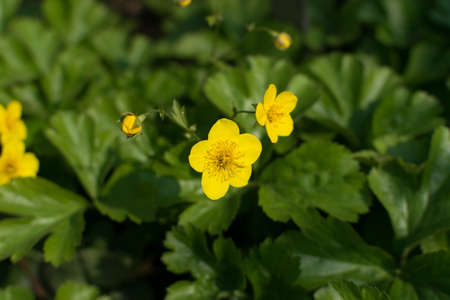 Small yellow flowers of Appalachian barren strawberry or Waldsteinia ternata in spring garden