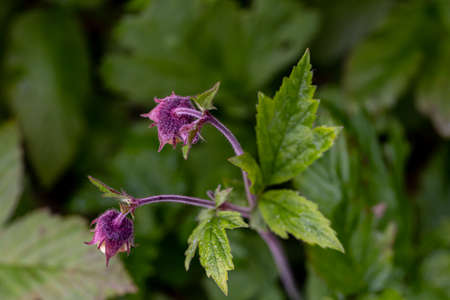 Beautiful macro closeup of colorful red Geum species Avens flowers with green leaves in garden on blurry background. Natural landscape art background wallpaper.