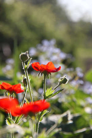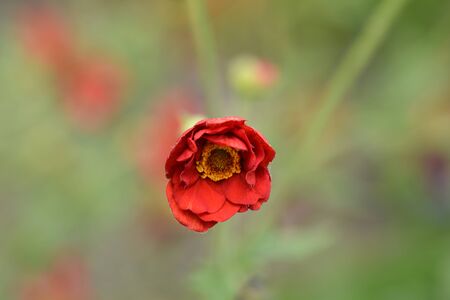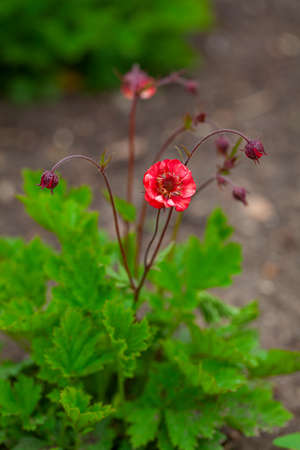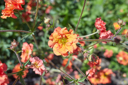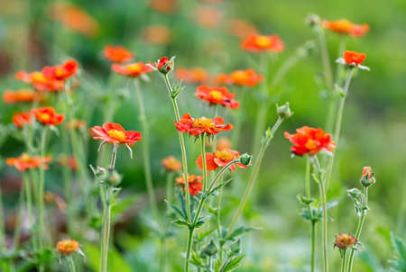 Chilean Avens, Scarlet Avens red flowers in garden, Geum coccineum floral background