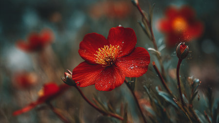 Vibrant red wildflowers bloom against a soft, blurred backdrop.