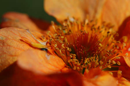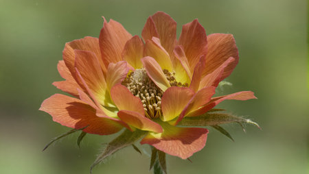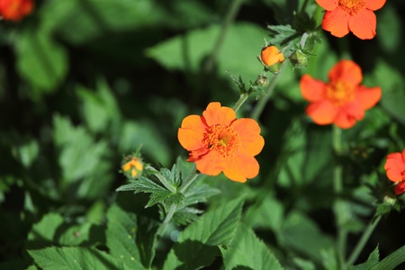 Macro shot of the Geum heldrichii flowering with saucer-shaped, bright orange flowers in loose clusters in bright sunlight in spring