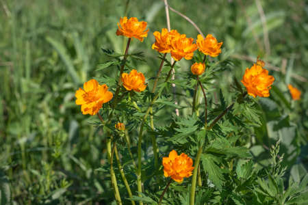Group of Trollius Asiaticus with copy space on greenery. Beautiful orange flowers of globeflower close up.
