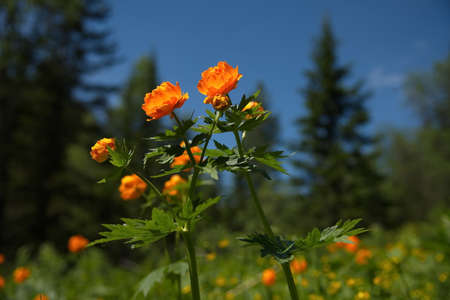 Orange flowers of Asian Globeflower Trollius asiaticus on a blurred background. Selective focus.