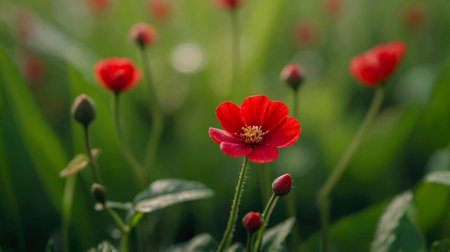 A small red flower growing in a lush green field, highlighting natural beauty.