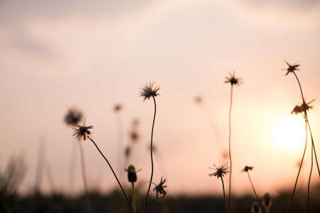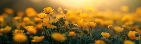 A field of yellow flowers blooms in the warm light of a setting sun, with the flowers in the foreground appearing in focus and those in the background becoming increasingly blurred.