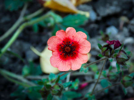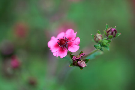 One delicate vivid red cinquefoil or Potentilla flower in a British cottage style garden in a summer day, beautiful outdoor floral background photographed with soft focus