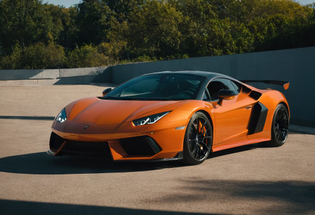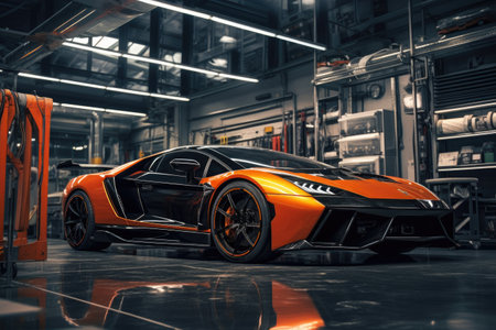 An orange sports car parked in a well-lit, spacious garage with clean concrete floors, luxury sports car in auto repair shop, AI Generated