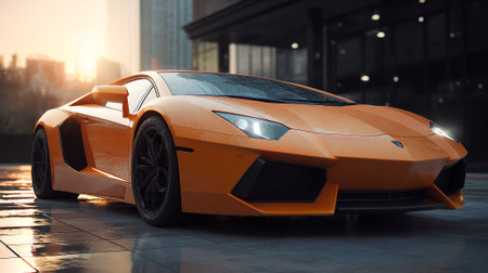 Sleek Orange Lamborghini Aventador Parked on Wet Pavement, Modern City Backdrop