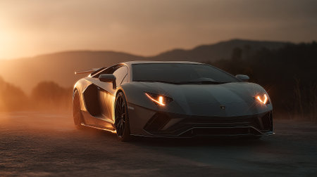 Luxurious black sports car driving fast on a desert road at sunset, leaving a cloud of dust