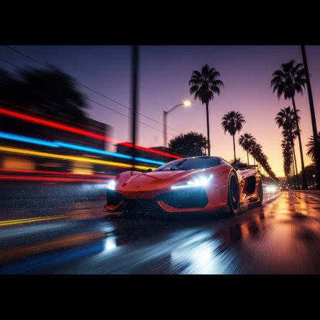 A vibrant digital artwork captures a dynamic scene of a modern red sports car in motion. Streaking lights create a sense of speed on a wet street lined with palm trees under a twilight sky.