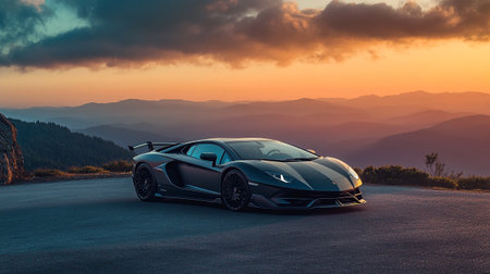 Sleek Modern Supercar with Glowing Taillights Stands Against a Sunset Sky