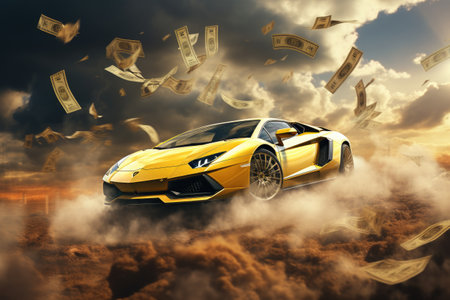 3D render of a super sports car with dollar notes flying around, Lamborghini flying through the money clouds, AI Generated
