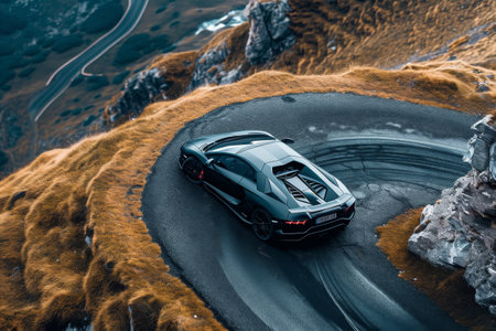 A black sports car speeds down a winding road with sharp turns and scenic surroundings, A luxurious sports car on a spiral uphill road, AI Generated