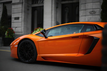 London, England - June 2018: orange Lamborghini Aventador SV supercar parked on a street in Knightsbridge area of Central London.