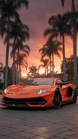 A sports car against a backdrop of palm trees in the summer sunset. Sleek orange sports car. Futuristic digital background. Concept of velocity and technology. High quality photo