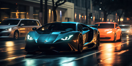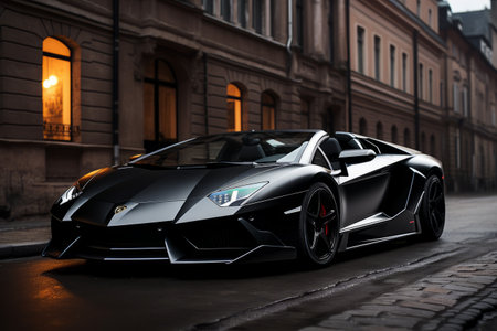 A close-up view presents a modern black sports car, emphasizing its design. The image showcases the vehicle's glossy finish, wheels, and headlights. The lighting creates shadows and highlights the car's shape. This image is suitable for automotive, design, and luxury-themed projects.
