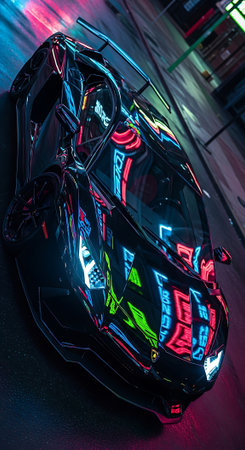 A sleek black sports car parked on a wet street at night, its surface reflecting vibrant neon city lights.