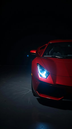 Model Version: pro | Model Category: Realism | Prompt: Photorealistic sleek red sports car, modern high-performance luxury design, positioned slightly right of center, front end facing viewer, illuminated dramatically against dark background, headlights emitting bright blue-white glow, casting sharp reflections, emphasizing aerodynamic curves and sharp lines, deep shadows, high-contrast spotlight effect, polished metallic surfaces, aggressive contours, futuristic design, bold minimalist atmosphere, visually striking, ultra-detailed, high-resolution, dramatic lighting, glossy reflections, cinematic photography style, professional automotive advertising quality. | Enhanced Prompt: Photorealistic sleek red sports car, featuring a modern high-performance luxury design, positioned slightly right of center with the aggressive front end facing the viewer. The car is dramatically illuminated against a deep, dark background, with its headlights emitting a bright blue-white glow that casts sharp, defined reflections across the polished metallic surfaces. The composition emphasizes the aerodynamic curves and sharp, futuristic lines, utilizing deep shadows and a high-contrast spotlight effect to highlight the aggressive contours. The overall atmosphere is bold and minimalist, creating a visually striking image with ultra-detailed, high-resolution rendering, glossy reflections, and a cinematic photography style befitting professional automotive advertising quality.