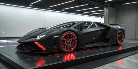 a sleek futuristic black sports car with red accents showcased on a raised platform in a modern showroom featuring sharp design elements red led lighting and high performance styling