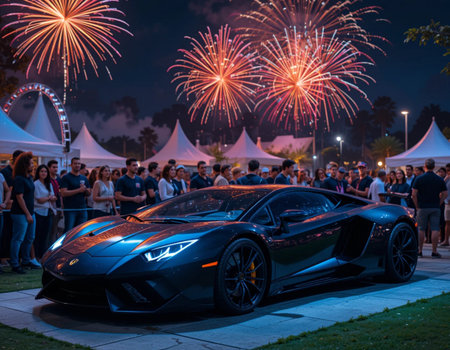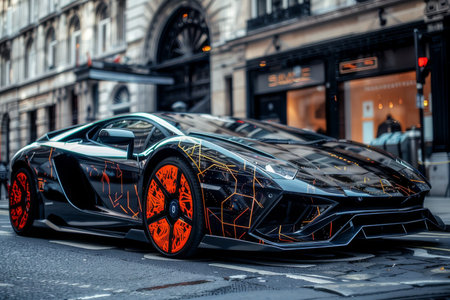 Discover a powerful, high-performance sports car, gleaming in a sophisticated, modern architectural environment. Its aggressive lines, metallic finish, and glowing details highlight luxury and advanced engineering.