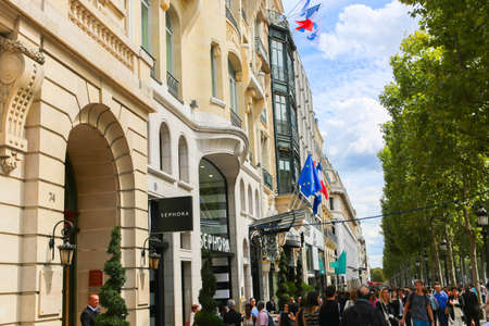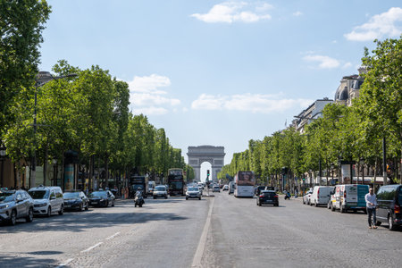Paris, France - August 28 2022: Champs Elysees, avenue in the 8th arrondissement of Paris, runs from Place de la Concorde to the majestic Arc de Triomphe selective focus