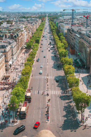 The view of Avenue des Champs Elysees from top of Arc de Triomphe. Famous luxury shopping road in Paris, France. Taken on June 15 2023