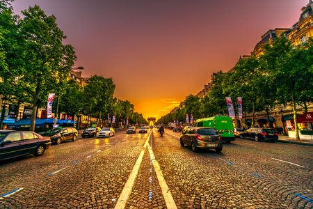 Paris, France - July 2, 2017: perspective view of Champs Elysees with Arc de Triomphe in the distance in a orange sunset sky with road traffic. The arch of Triumph is a famous landmark in Paris.