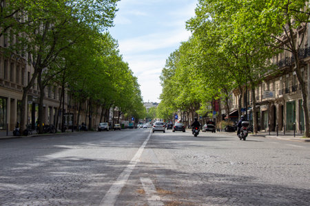 Paris, France April 20 2022: Panoramic view of the Boulevard Haussmann on a sunny day.
