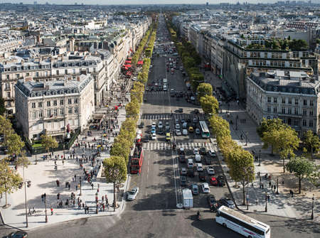Close-up of busy avenue of Champs-Elysees view from above in Paris towards downtown
