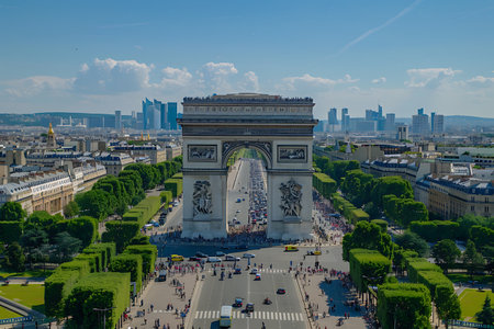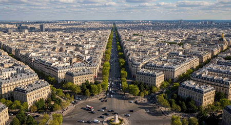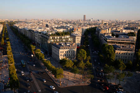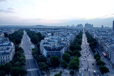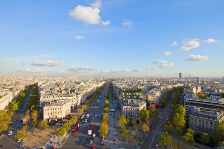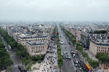 Paris, France, panoramic aerial view of Avenue des Champs-Elysees from Arc de Triomphe