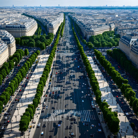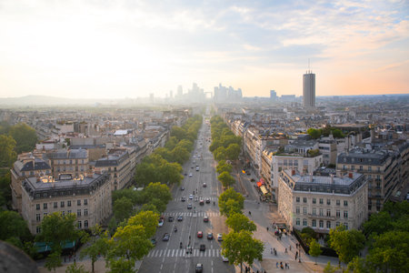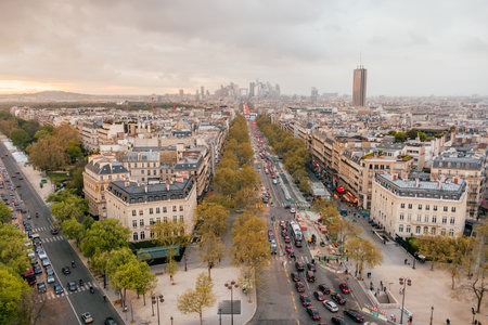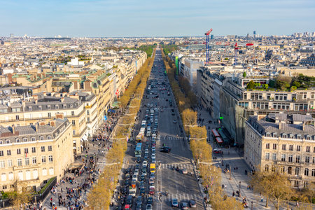 Paris, France - 03 April 2025: Champs Elysees avenue seen from Triumphal arch top