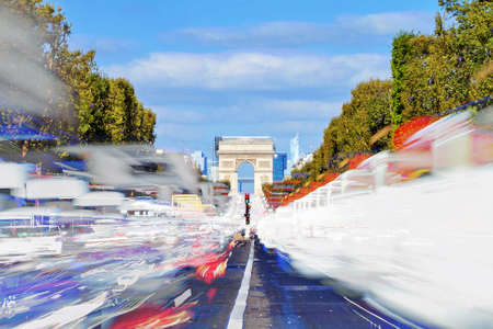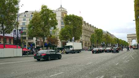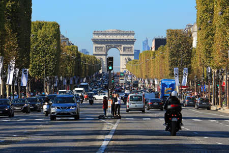October 14, 2017, Paris, France, traffic on the Champs Elysees on the background of the Arc de Triomphe
