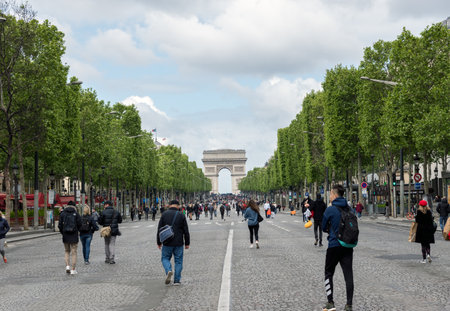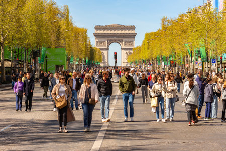 Paris, France - 06 April 2025: People walking on Champs Elysees avenue with Triumphal arch (Arc de Triomphe) at background