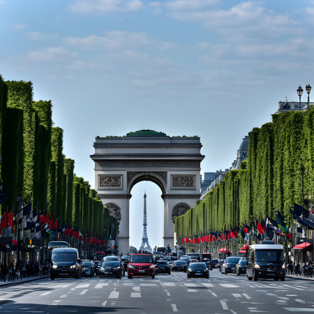 Captivating view of avenue des champs elysees paris traffic beneath a cloudy sky