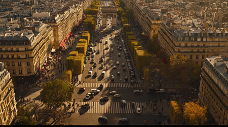 View of two tree-lined avenues leading to the Arc de Triomphe and all the urban movement that surrounds it